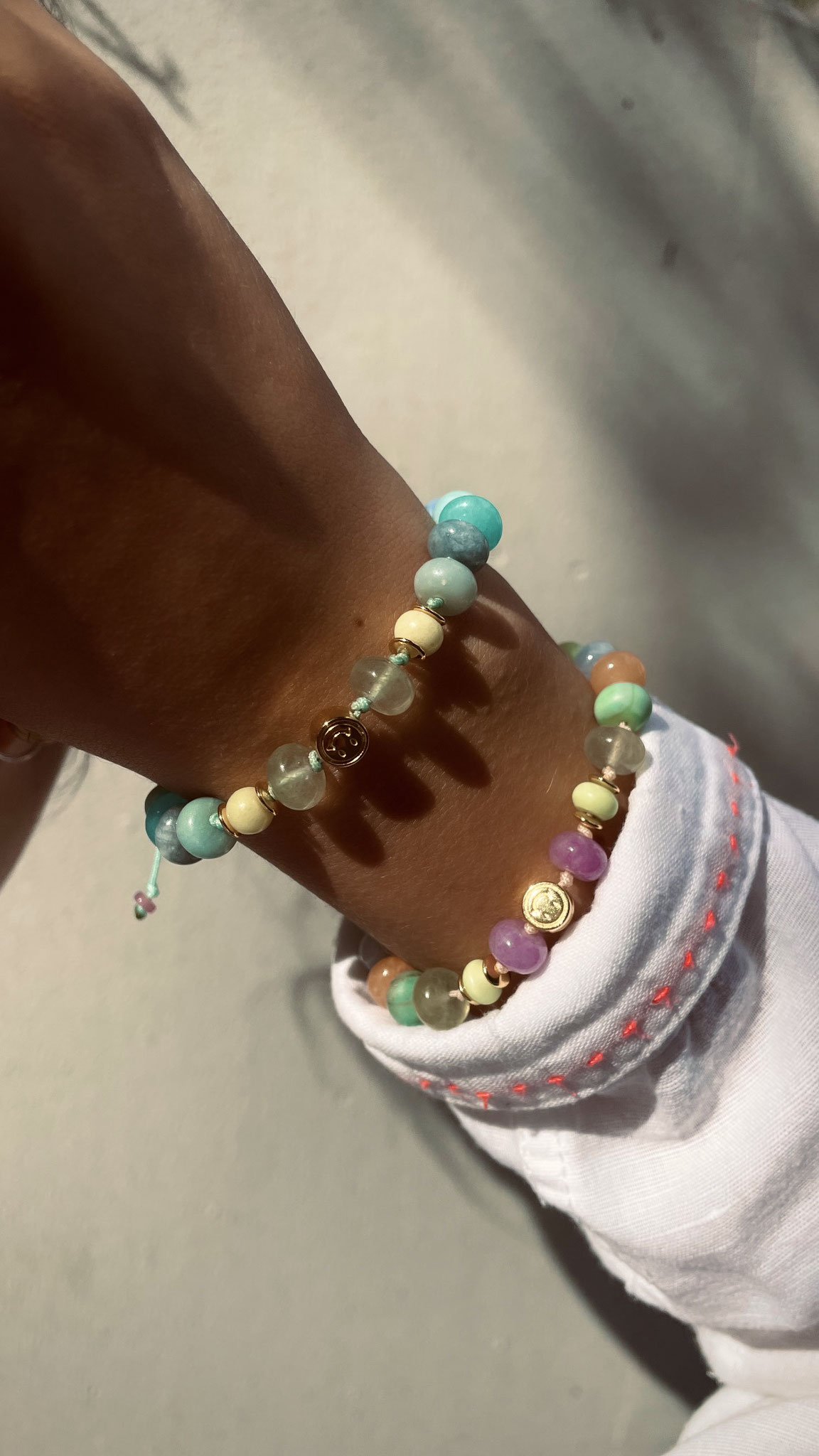Jede Perle ist einzeln verknotet und somit hast du ein leichtes, ums Handgelenk spielerisches Armband.