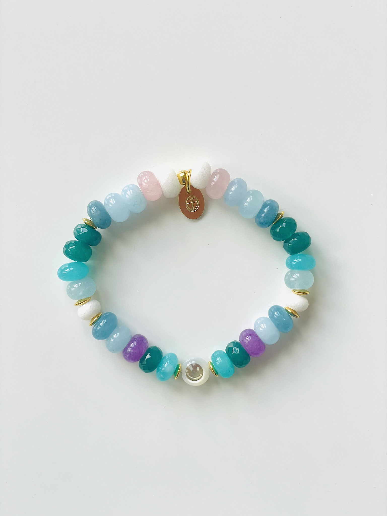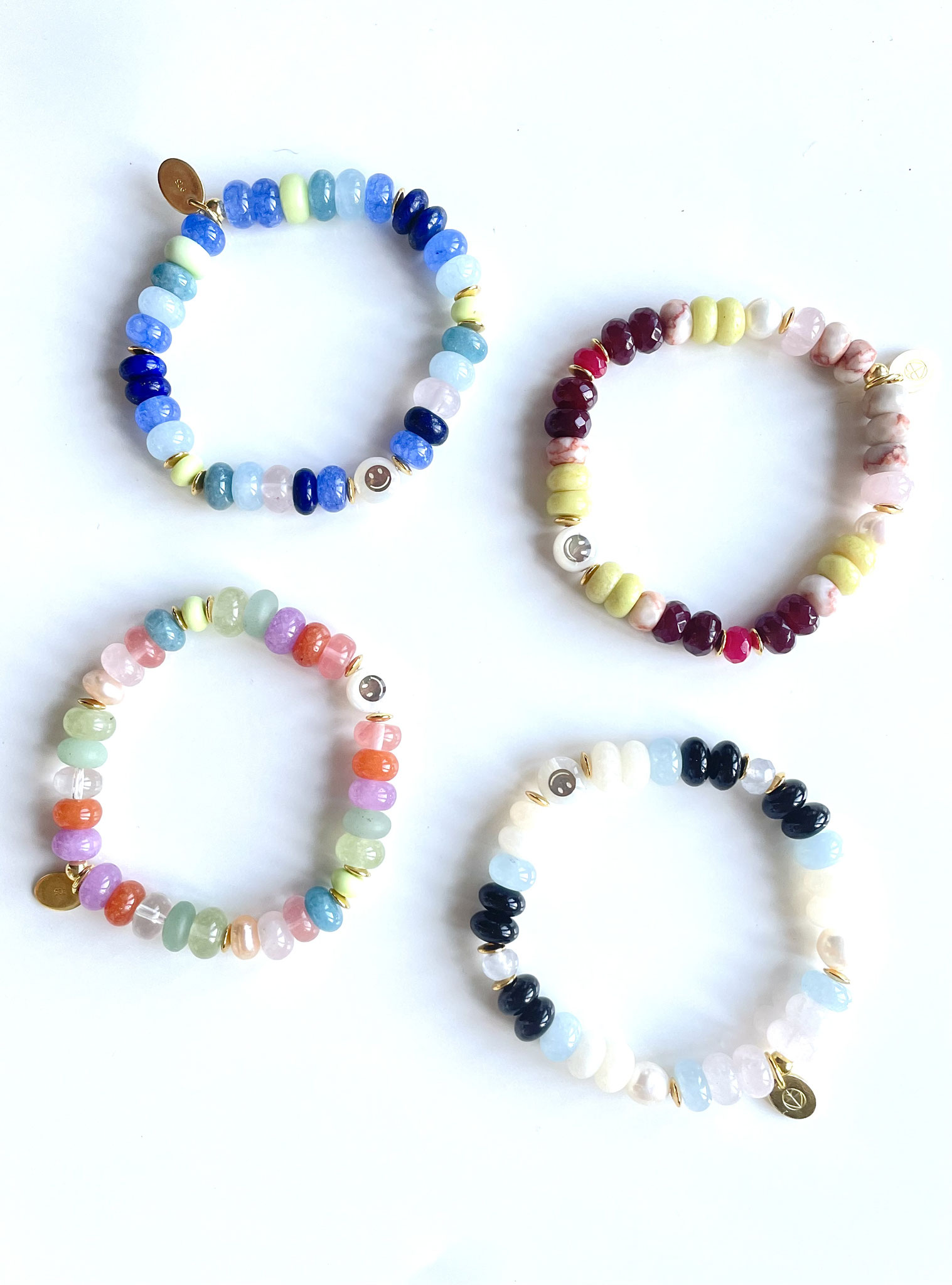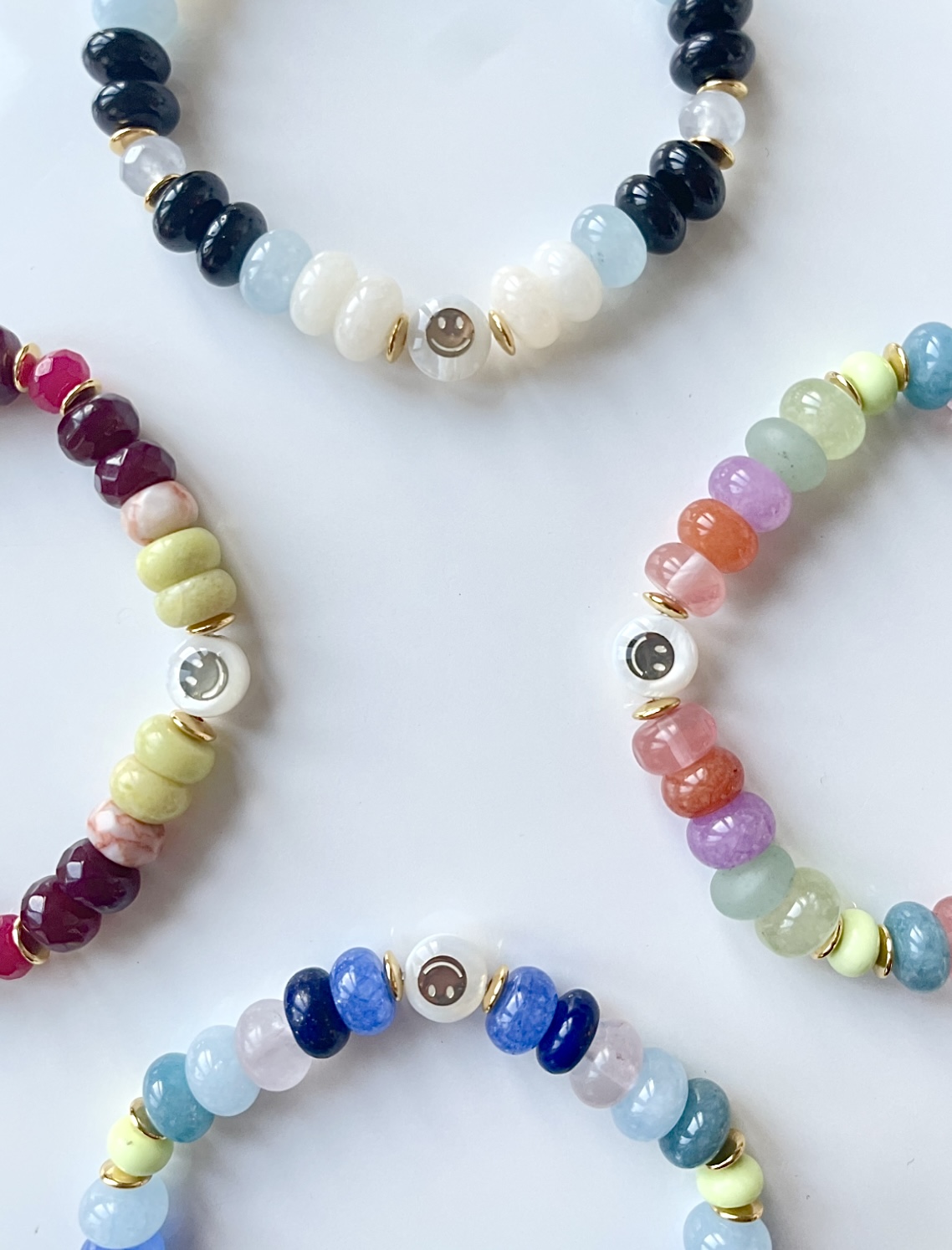 Unsere NOBLE SMILE Collection ist ein wunderschönes Armband Modell, das wir mit Edelstein-Rondellen in AAA Qualität und einem Zwischenstück SMILEY aus Perlmutt mit einem goldenen eingelassenen Smiley gefertigt haben. Die bestechenden Farben und ihre Ausstrahlung lassen keine Wünsche übrig!